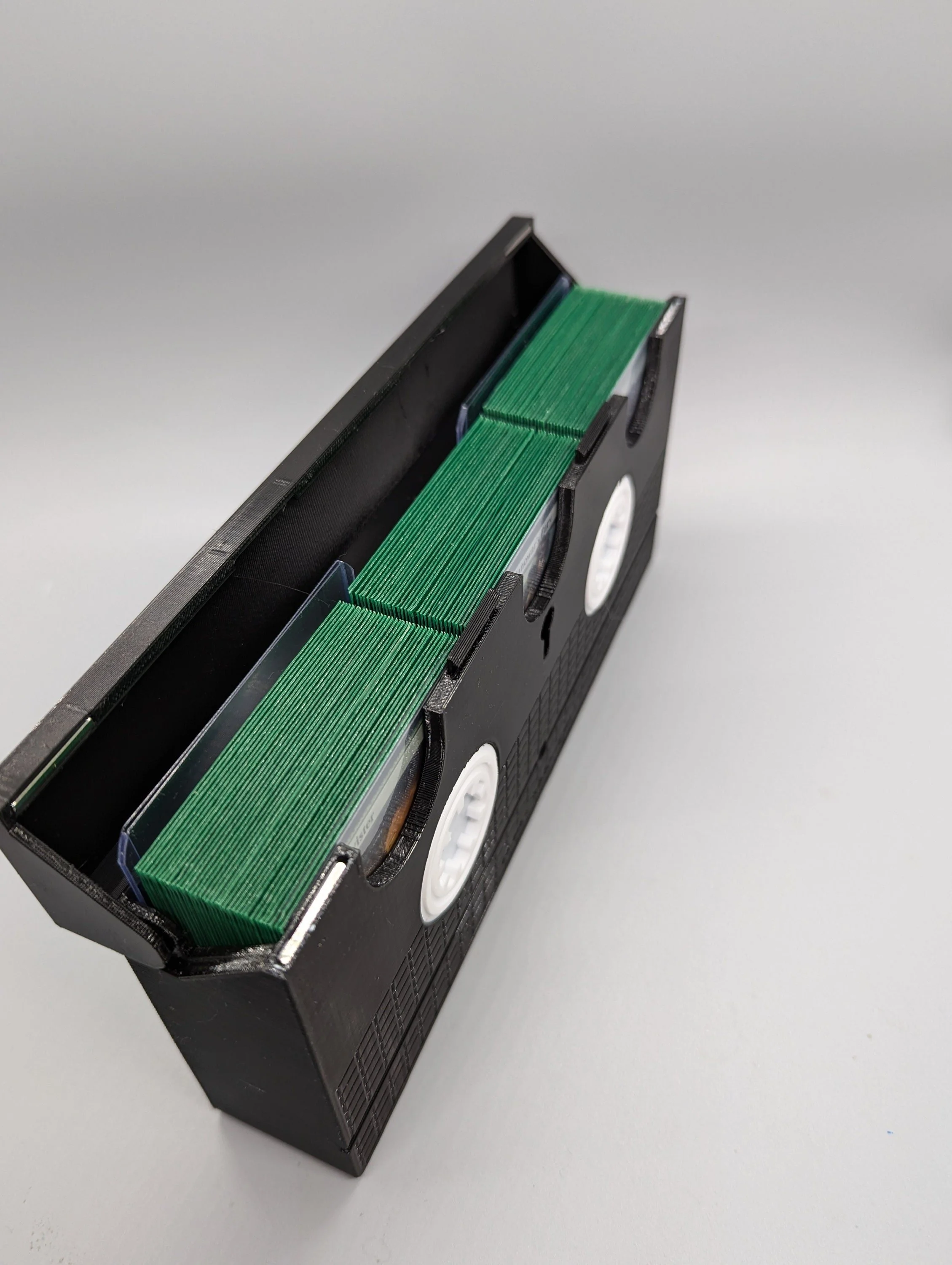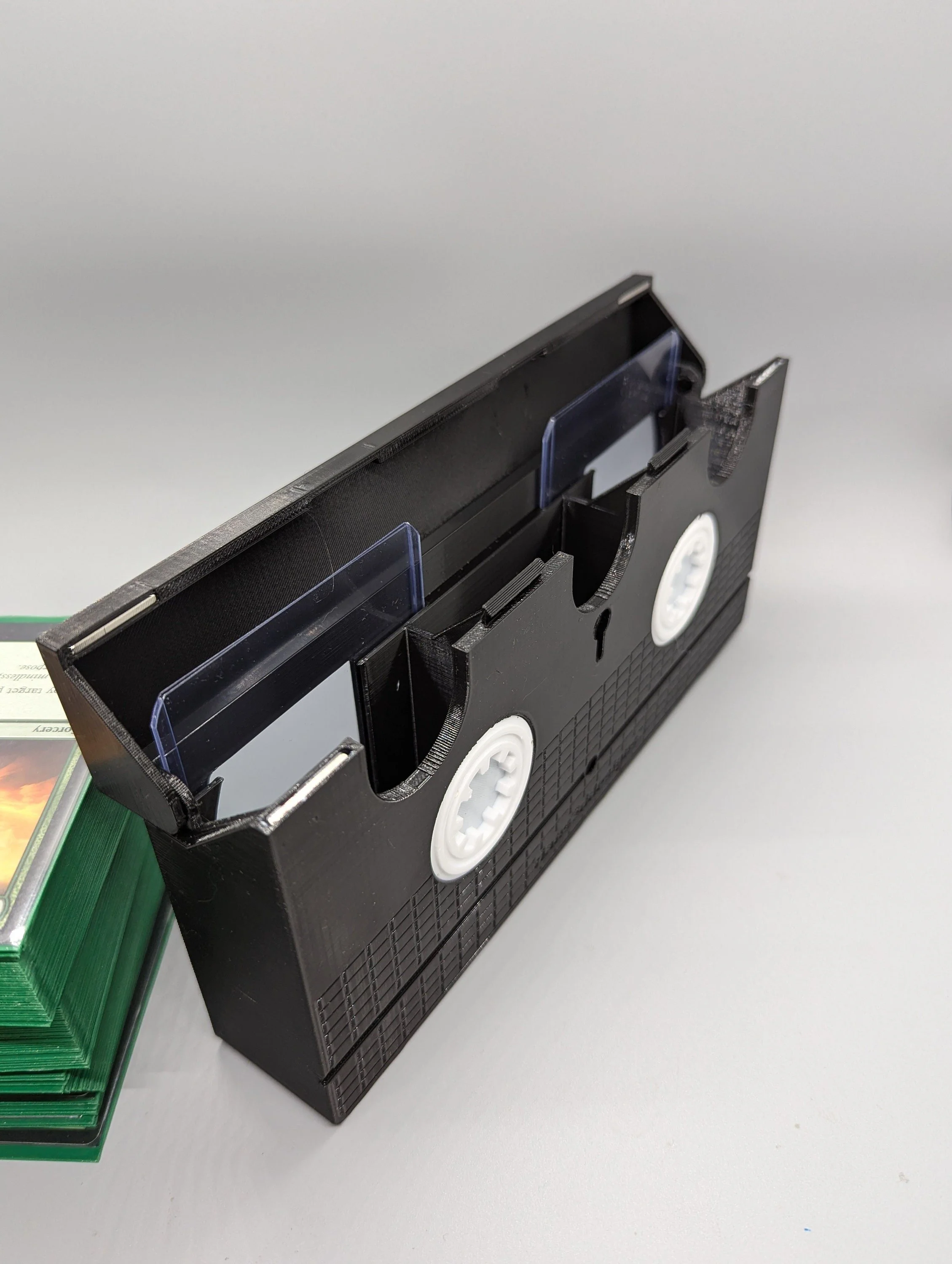 The top lid latches and hinges, and a toploader is there (like the copy glass), but you can also put your commander in there. Slide out the toploader, and grab your dice, counters, etc.
